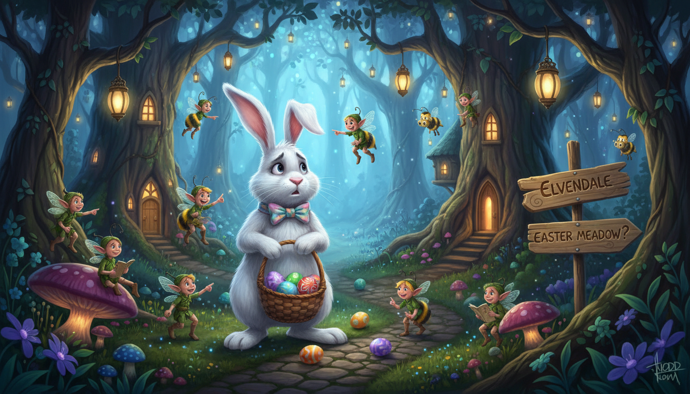 Er ist viel zu früh dran und auch noch am falschen Ort: Der Osterhase im Wichtelland.