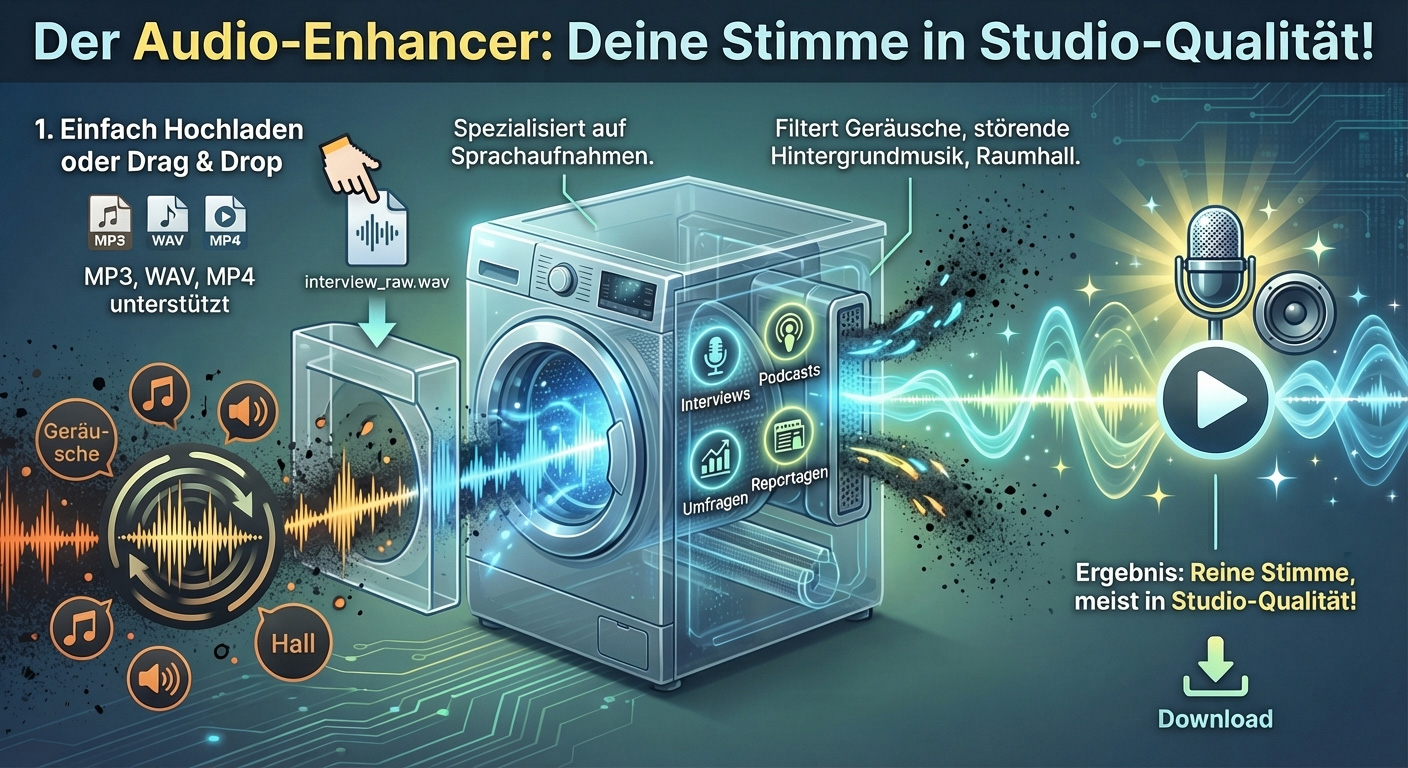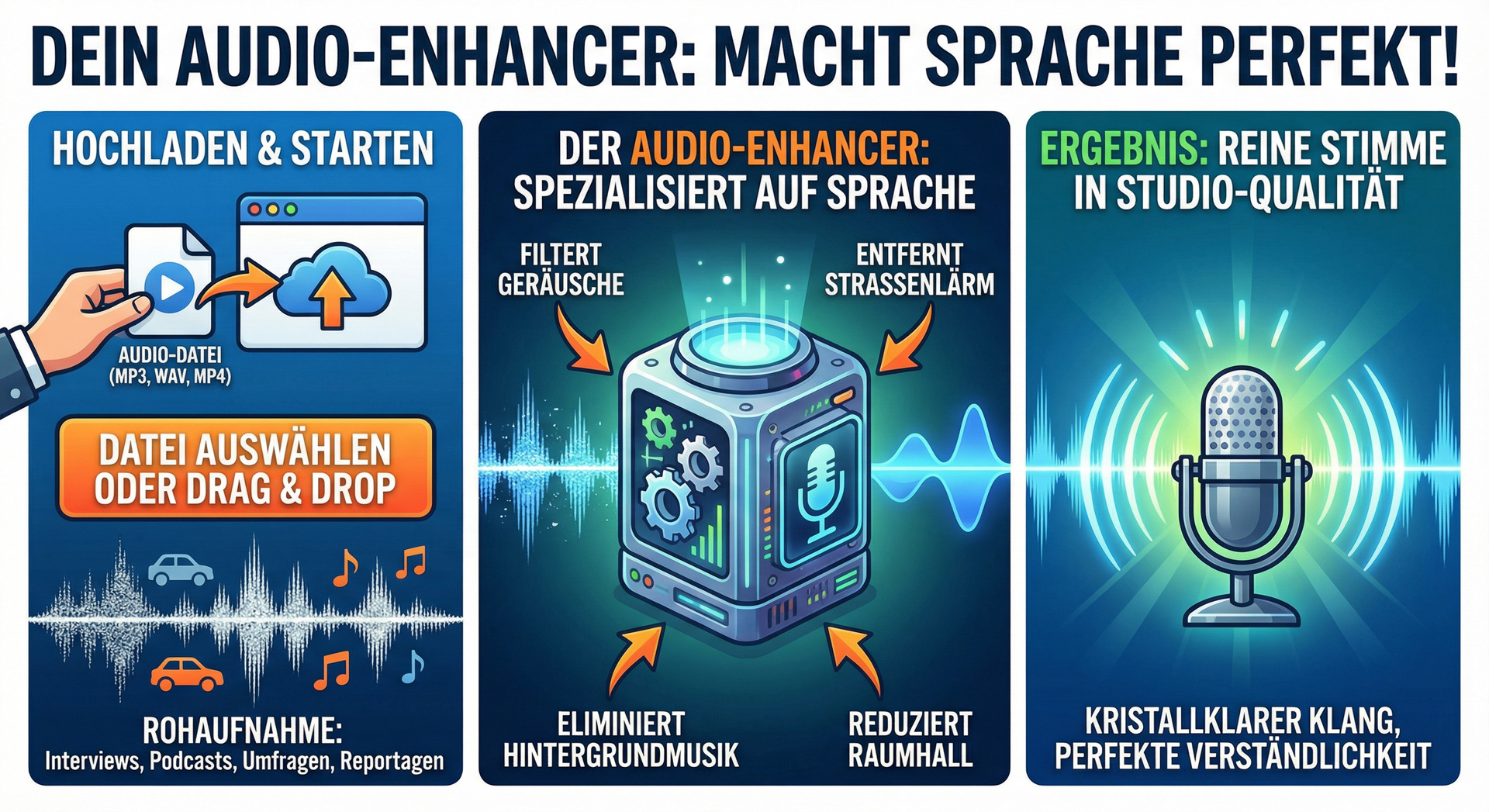 Audio-Enhancer: Verbessert Sprach-Aufnahmen, indem Störgeräusche entfernt werden und die Sprachverständlichkeit optimiert wird. Ideal für Interviews, Reportagen, Umfragen oder Podcasts.