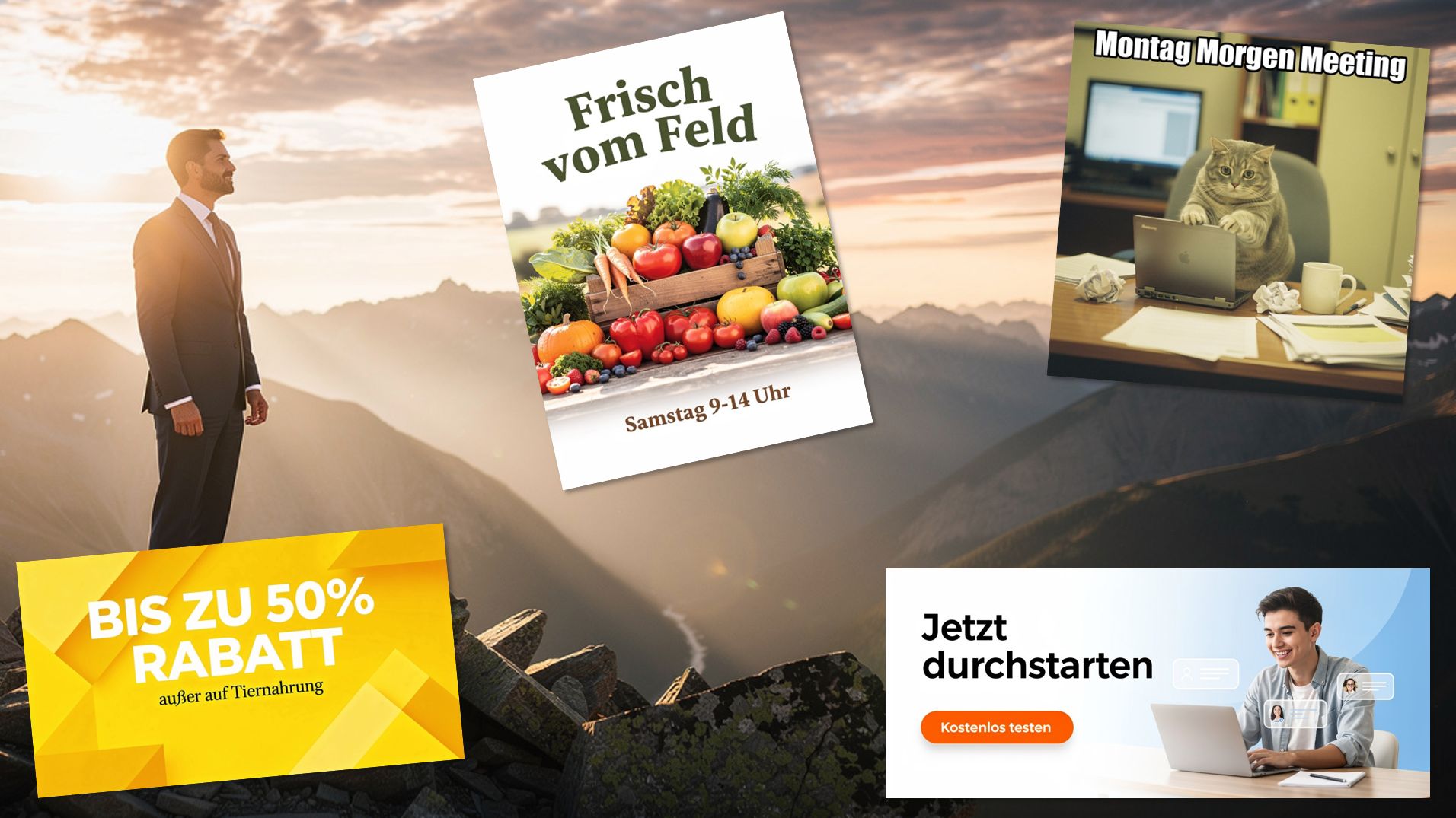Lest auf jeden Fall unsere Anleitung für perfekte KI-Bilder. Dort findet ihr ganz viele Beispiele aus der täglichen Praxis und Bilder-Prompts, die ihr sofort einsetzen könnt: Memes, Social Media Grafiken, Infografiken, Werbe-Banner, Flyer, Illustrationen, Produktfotos, Portraits, Landschaften und vieles mehr.
