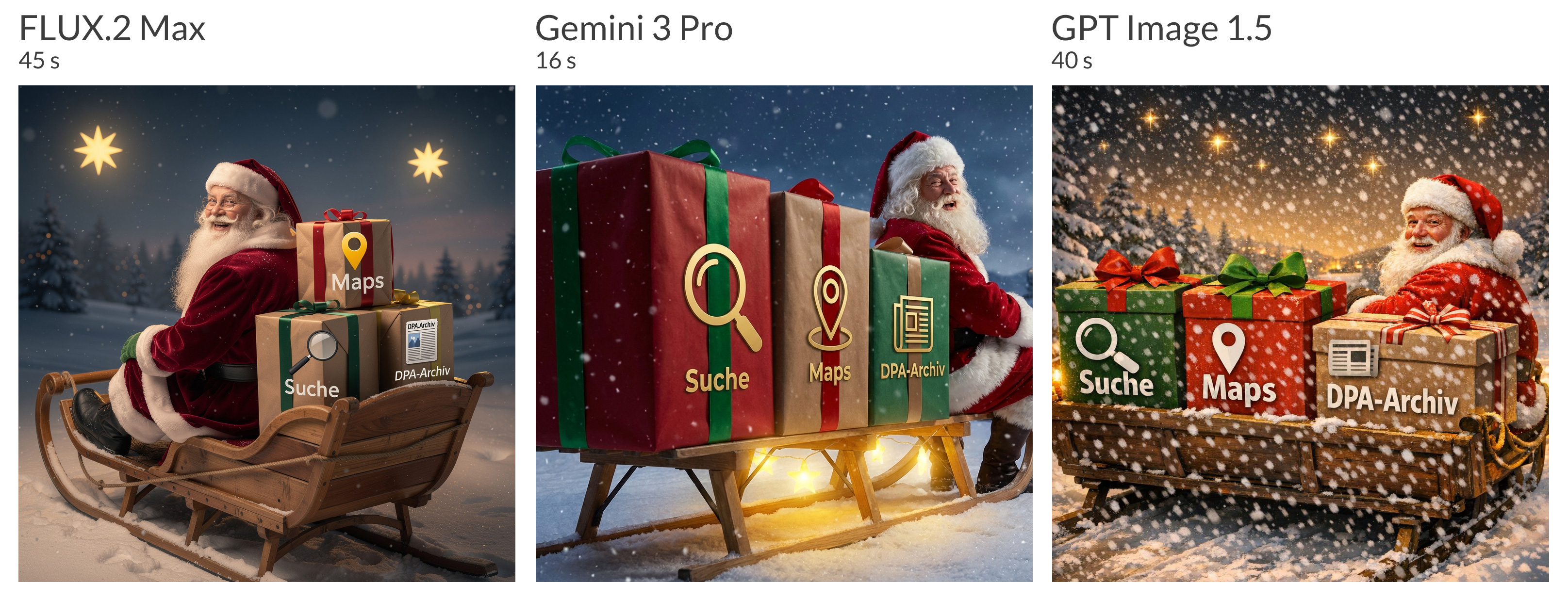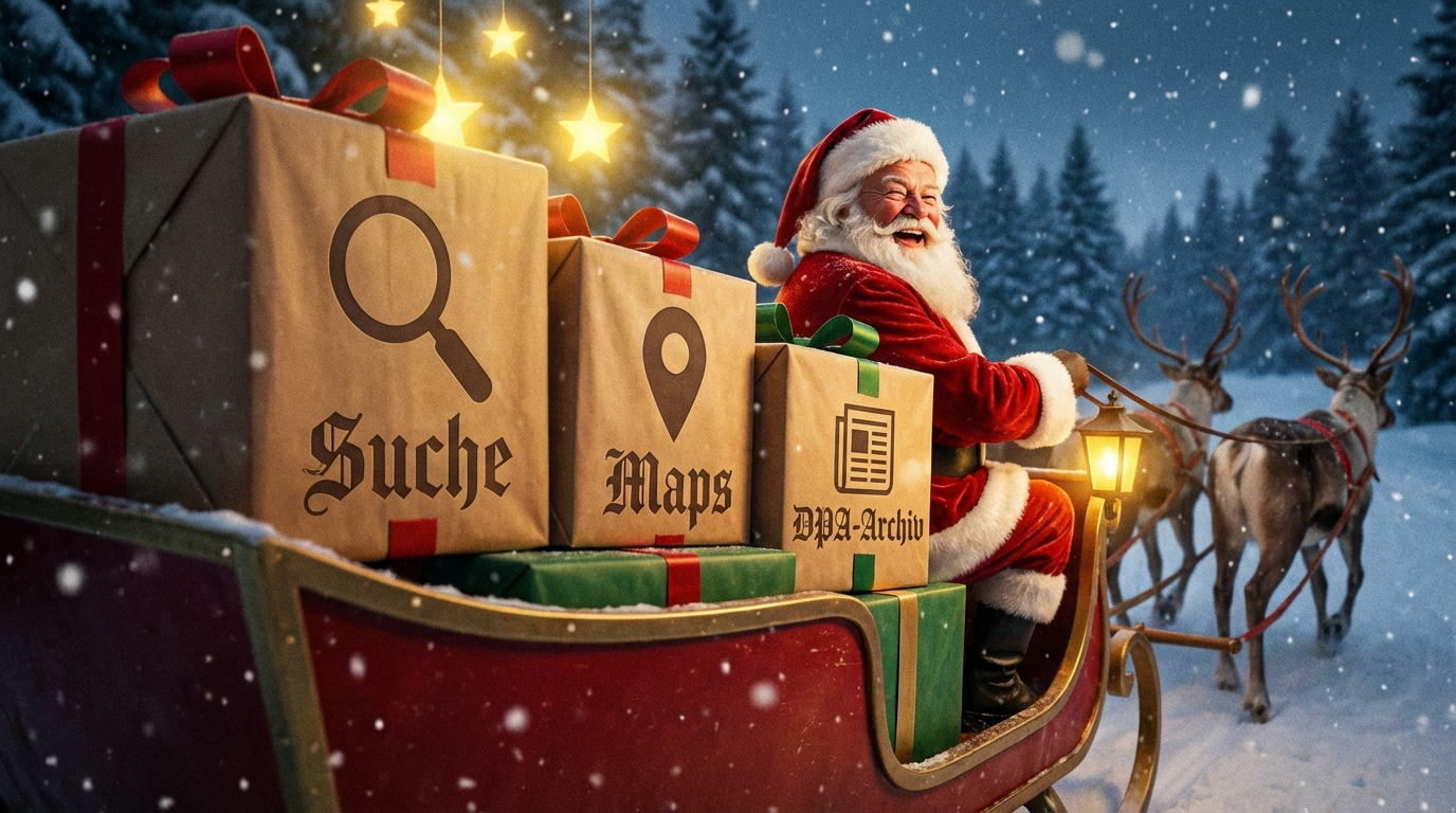 Weihnachtsmann mit langem, weißen Bart auf seinem Schlitten. Auf dem Schlitten liegen drei sehr große Geschenkpakete: Auf dem ersten Paket: ein großes Lupen-Icon und das Wort „Suche“. Auf dem zweiten Paket: ein Location-Icon und das Wort „Maps“. Auf dem dritten Paket: ein Zeitungs-Icon und der Text „DPA-Archiv“. Die Kamera zeigt den Schlitten seitlich von hinten, so dass die Pakete groß zu sehen sind. Der Weihnachtsmann dreht sich zu uns um und lacht. Abendliche Winterlandschaft. Es schneit. Sterne tauchen den Schlitten in ein gelbes Leuchten. Weihnachtliche Farben: rot, grün, braun. Fotorealistisch.