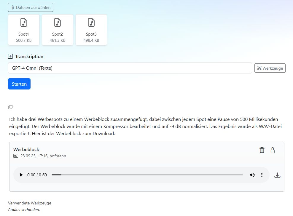 Besonders leistungsfähig wird die KI, wenn sie selbst Daten abrufen kann. Wir haben die AI-Tools an die Radio Creator Webseiten-Analyse (OnLineTools) und die Webradio Session-Daten (onRtools) angeschlossen.