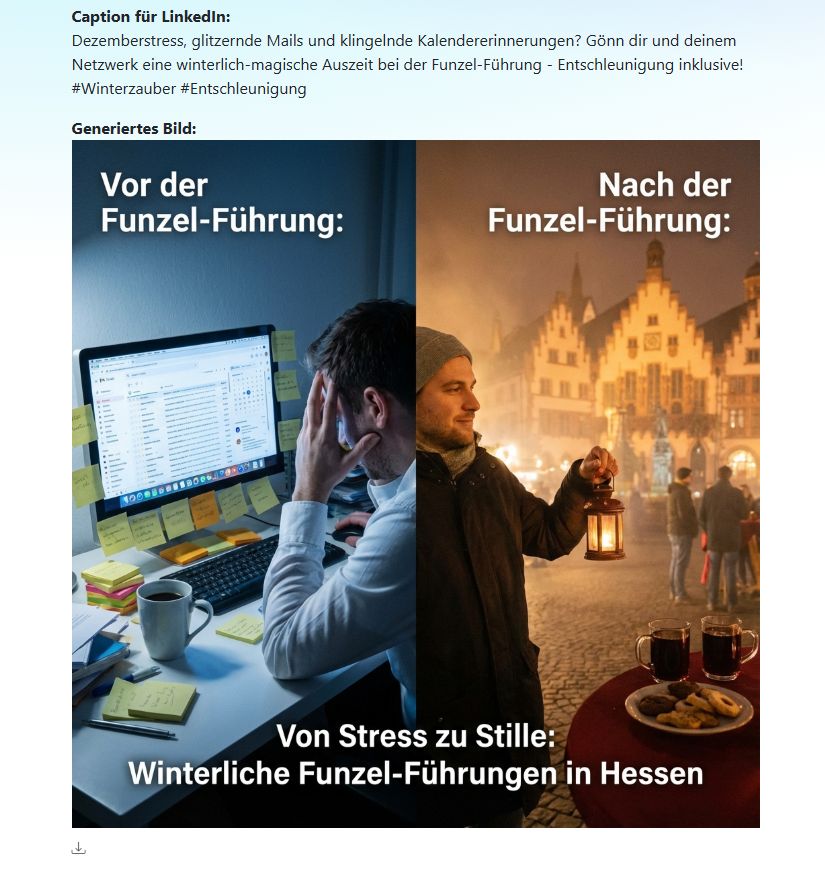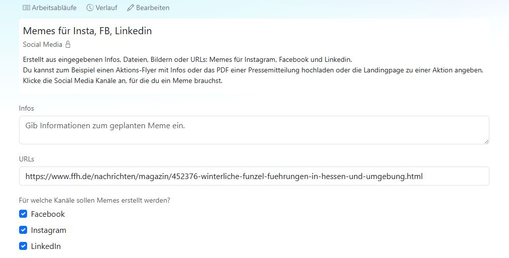 Das geht mit dem neuen KI-Arbeitsablauf im Content-Assistenten. Du findest ihn im Marktplatz unter Social Media -> Meme-Generator (FB, Insta, LinkedIn).