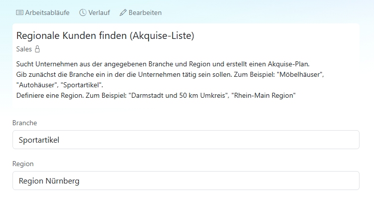 Du findest die Vorlage im Content-Assistenten unter Marktplatz - Sales - Regionale Kunden finden. Passe sie an deine Bedürfnisse an.