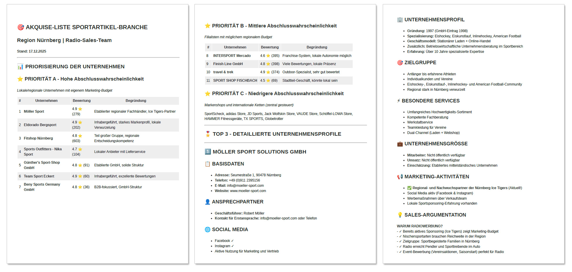 Erstelle eine Liste mit Namen, Bewertungen und Kontaktdaten.