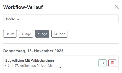 Der Verlauf zeigt alle Ergebnisse von Arbeitsabläufen, die du in den vergangenen 14 Tagen verwendet hast. Klicke auf den Button Verlauf, um den Workflow-Verlauf zu öffnen.